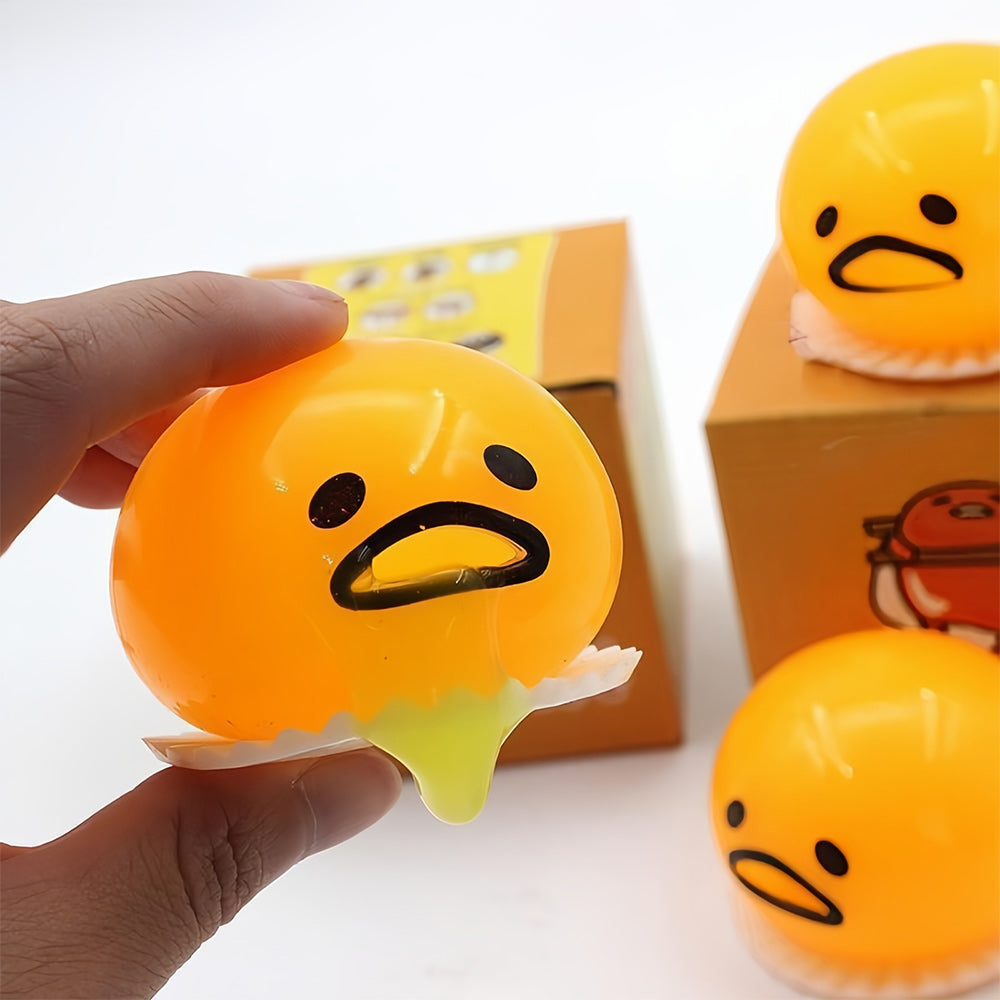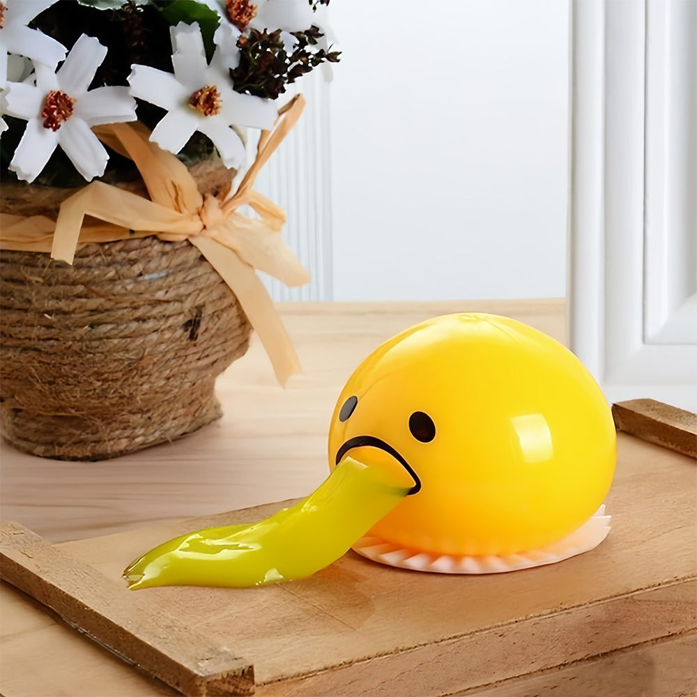 - Mit diesem Stressball können Sie Ihre Mitarbeiter oder Kinder immer auf das kleine Eigelb drücken lassen, und es wird auch das gelbe Gel ausspucken. Wenn du ein bisschen drückst, kotzt er nur ein bisschen, aber wenn du super gestresst bist, kannst du ihn so hart kotzen lassen, dass sein gesamtes flüssiges Eigelb herauskommt ... äh ... Noch schlimmer - wenn du den Kopf drückst, wird er werde seine Kotze wieder lutschen.