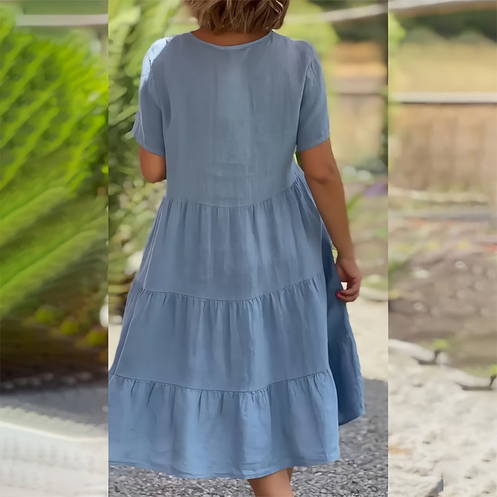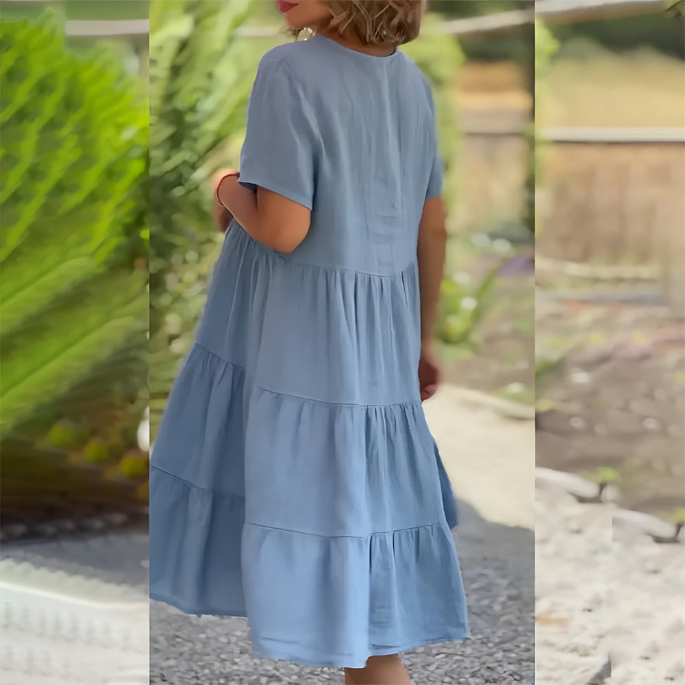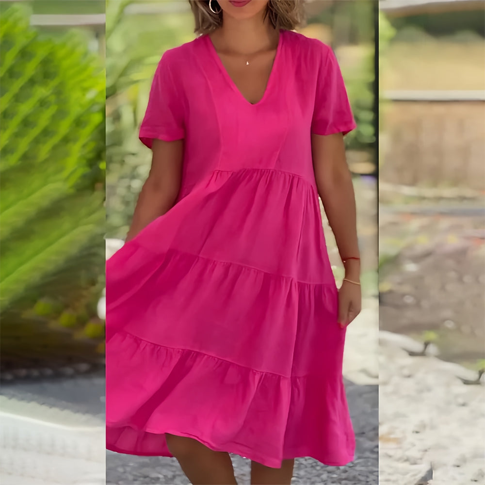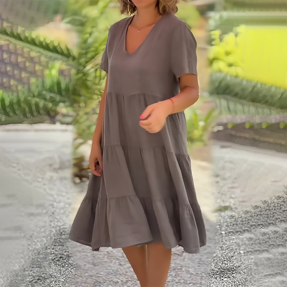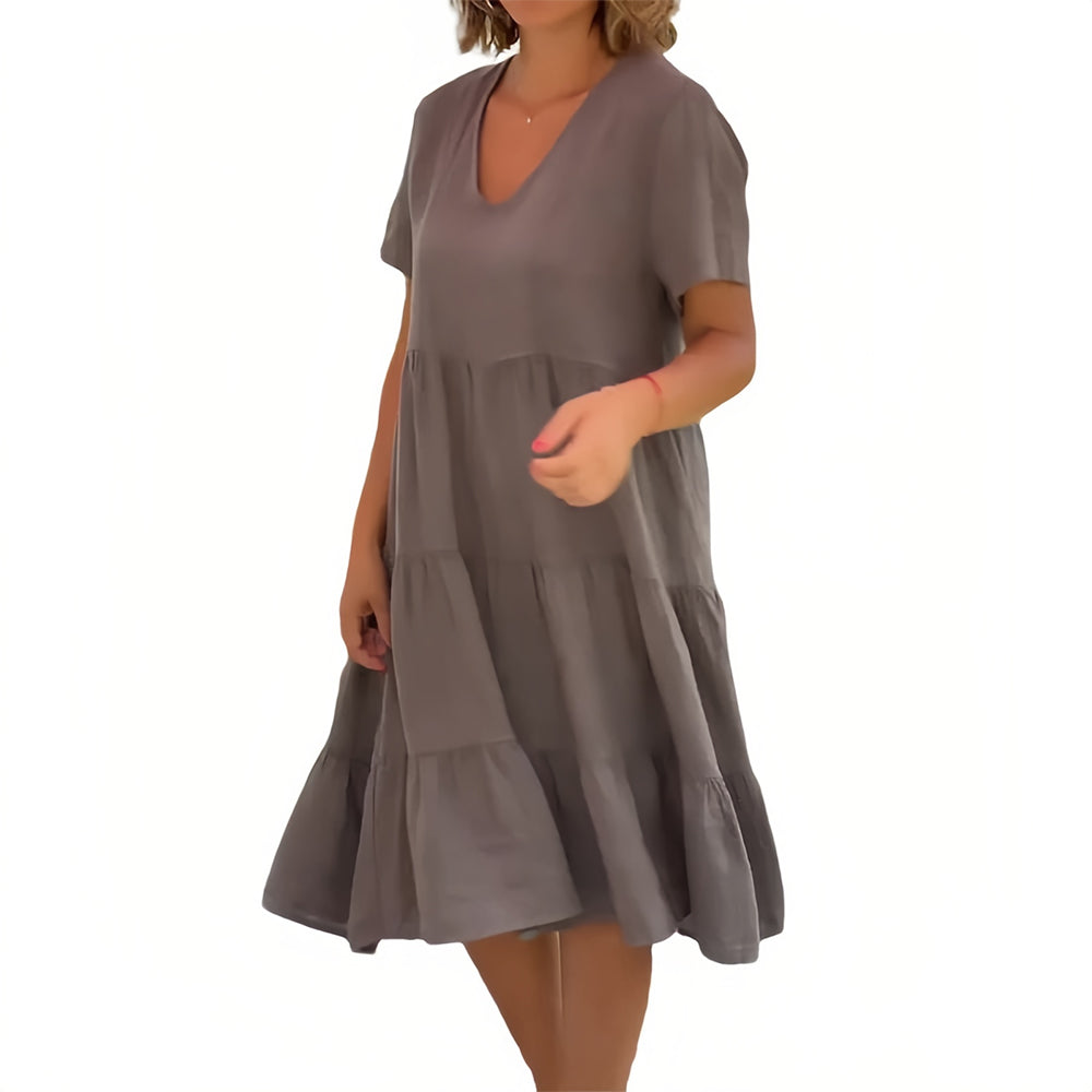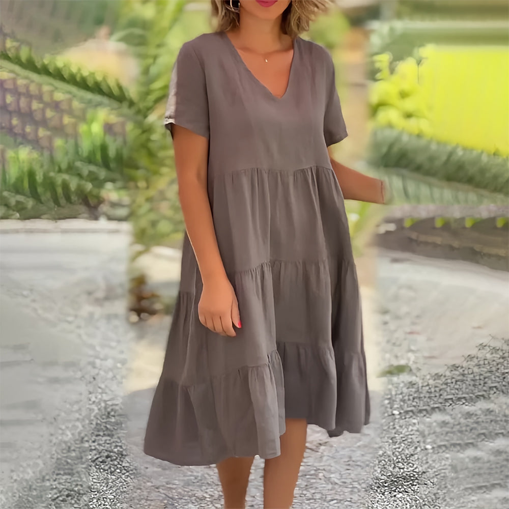 Baumwollleinen V-Ausschnitt Einfarbiges Kleid