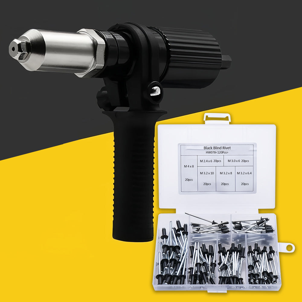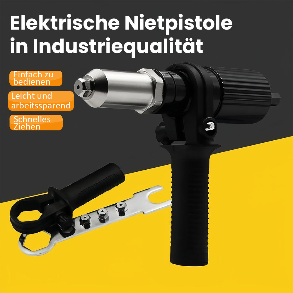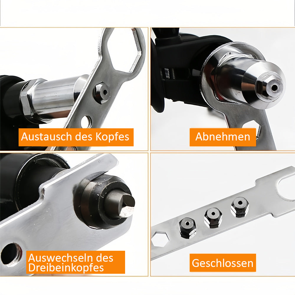 - Nietpistolenadapter-----Enthält eine geschmiedete Nietpistole aus legiertem Stahl, einen flexiblen Rotor und 4 verschiedene passende Bolzen zur Befestigung von Nieten, die alle als Einheit zusammengebaut werden. Effizient, stark und schnell. Mit einer zusätzlichen rutschfesten Spannvorrichtung, die eine hohe Stabilität gewährleistet.