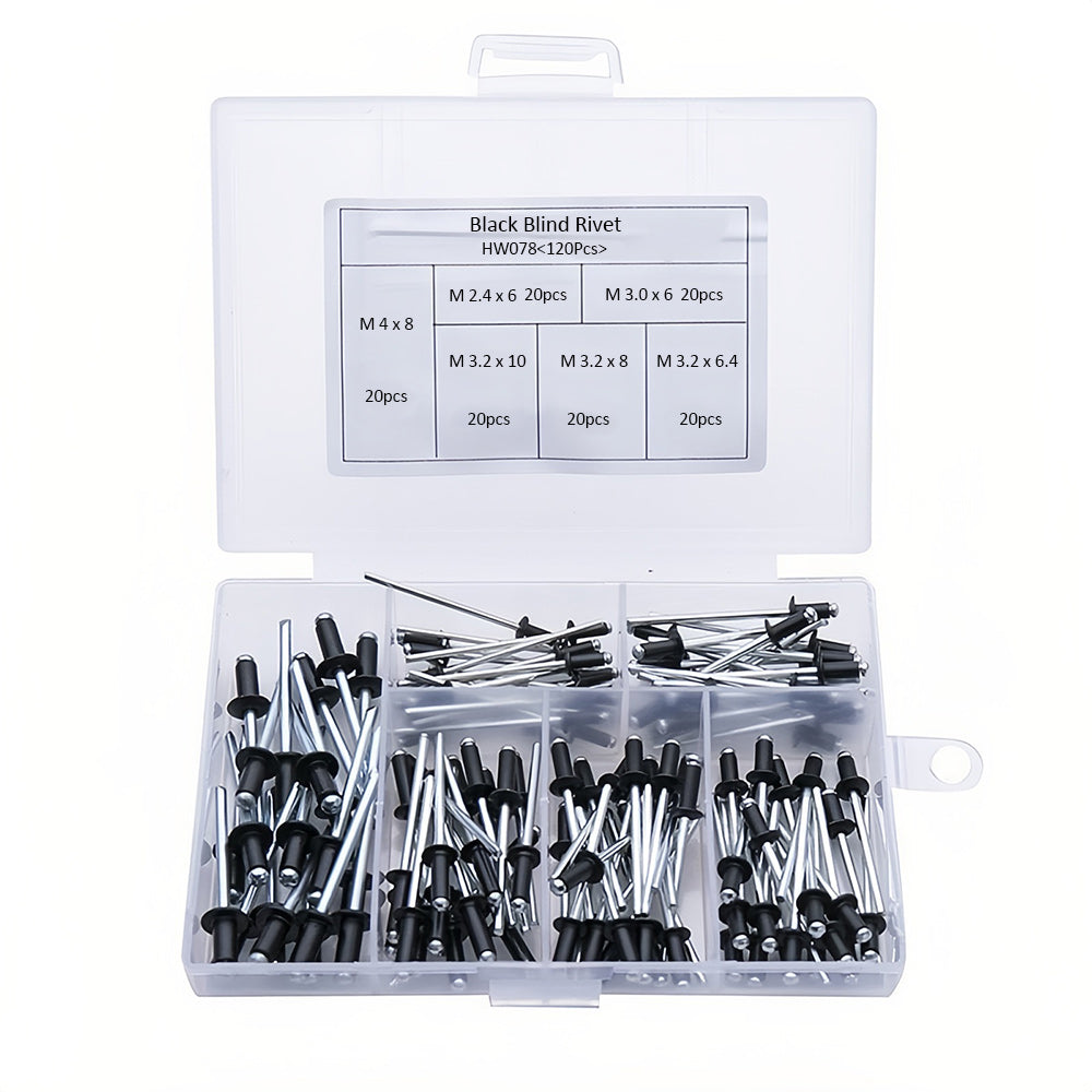 - 120 Stück Nieten-----Enthält 6 verschiedene Größen Blindnieten (Aluminium Nietkopf und legierter Stahl Nietkern): ①M2.4 x 6mm, ②M3.0 x 6mm, ③M3.2 x 6.4mm, ④M3.2 x 8mm, ⑤M3.2 x 10mm, ⑥M4 x 8mm. Dieses Produkt hat alles, was Sie brauchen, um die Nietarbeit zu erledigen.