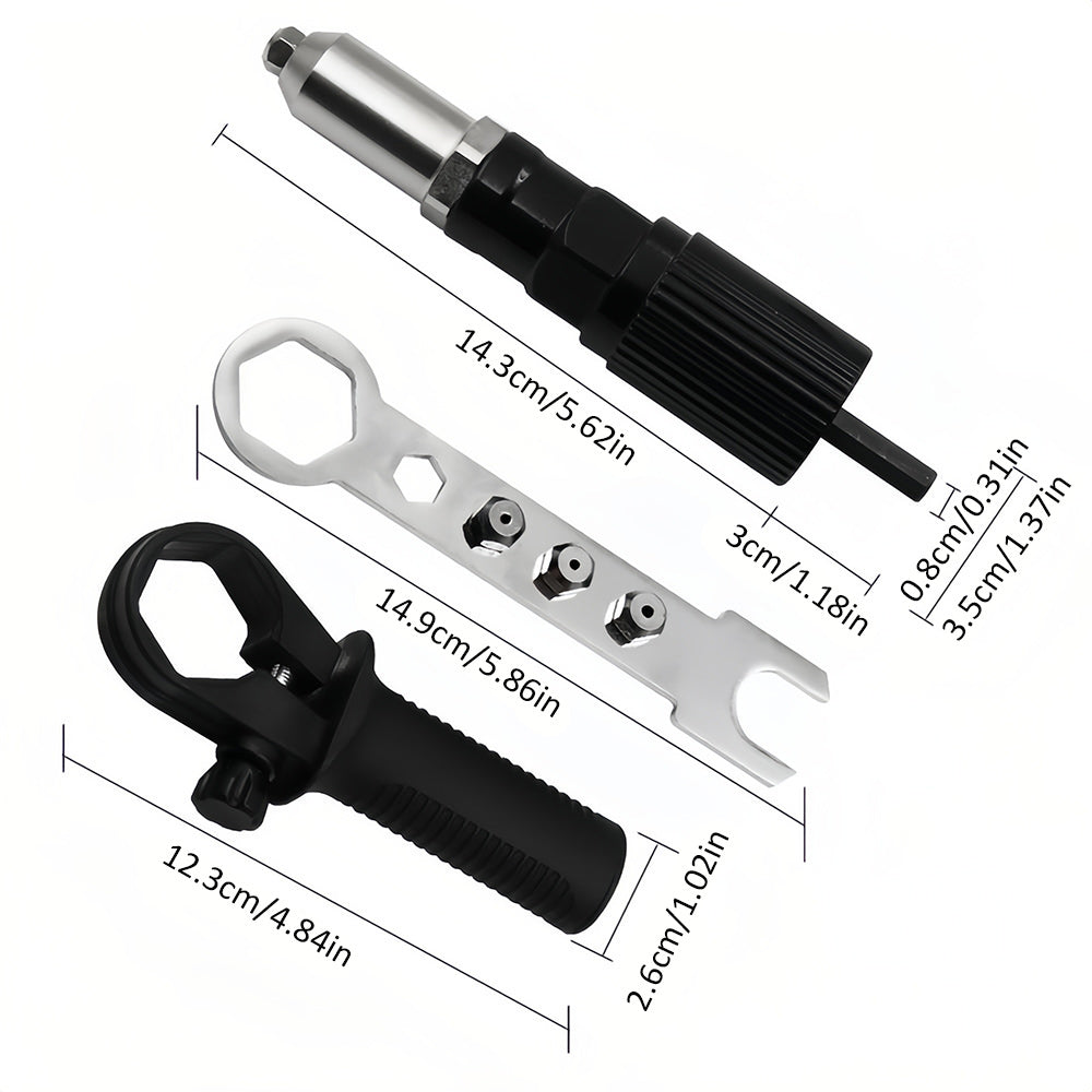 - Cordless Drill Electric Rivet Gun Adapter-Professional Riveting Insert Nut Hand Tool Kit mit Aluminium-Guss-Gehäuse und einem rutschfesten Griff-4pcs Convertible Kopf und ein Schraubenschlüssel.Unsere Rivet Gun Metall Adapter haben weniger Lärm, effizienter, kleine Größe und leicht zu tragen, universelle Bohrer Befestigung leicht anwenden Mutter Nieteinsätze auf verschiedene Materialien.