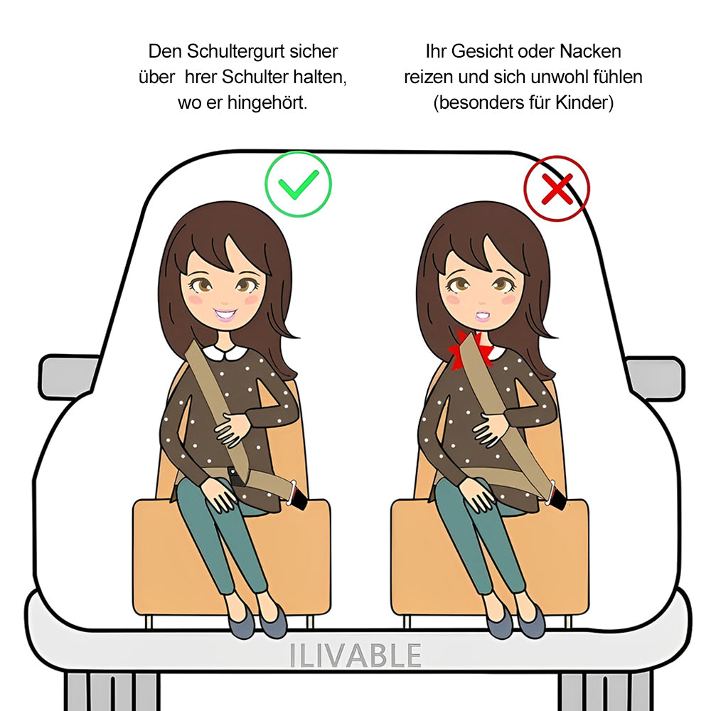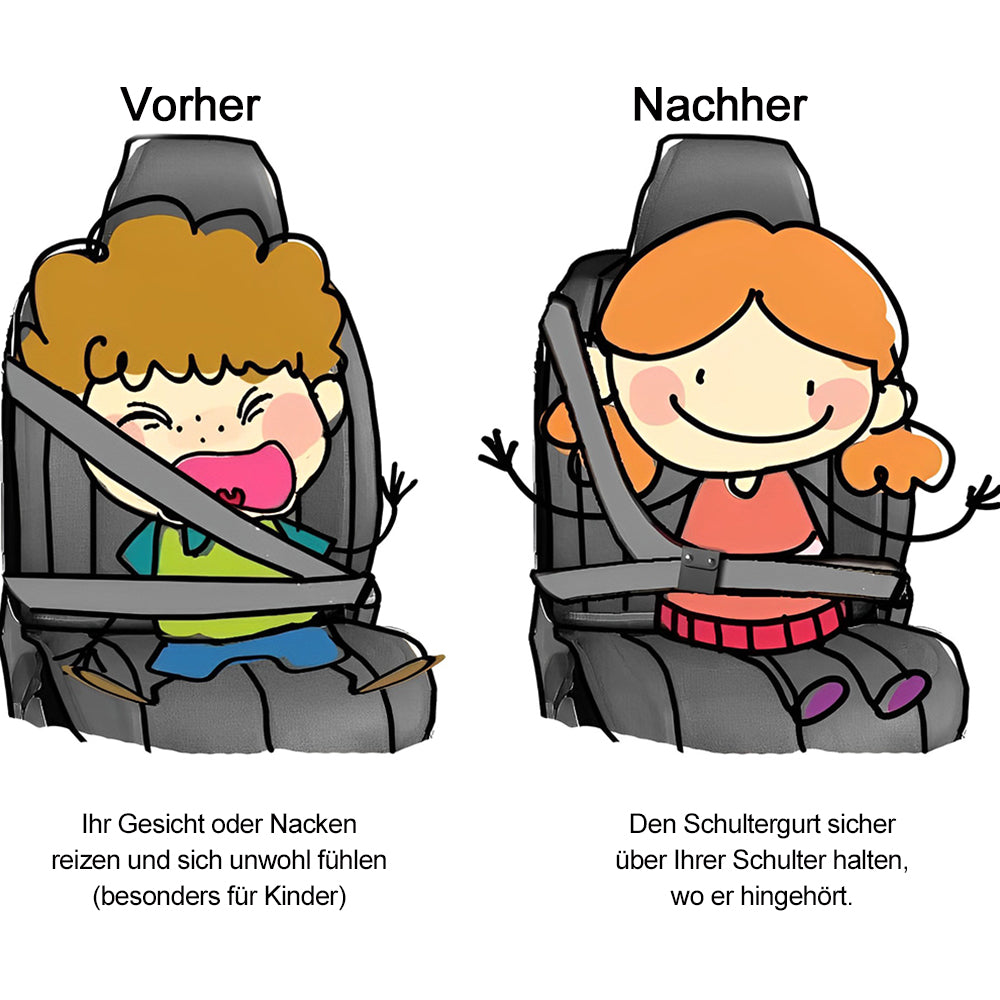 - ✔Sicherheitsgurt straff halten: Seitliches Verschieben verhindern, das Gesicht, den Nacken oder die Brust nicht irritiert.