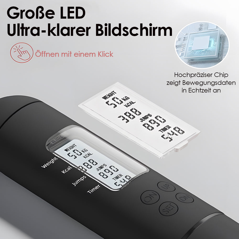 - 【LED-Display】Das digitale Springseil verfügt über ein HD-LED-Display, das den Timer, das Gewicht, die Kalorien und die Kreise anzeigt. Stellen Sie Ihr Gewicht ein und verfolgen Sie die Zeit, die Anzahl der Sprünge und die verbrannten Kalorien, um Ihre Fitnessziele effektiver zu erreichen.