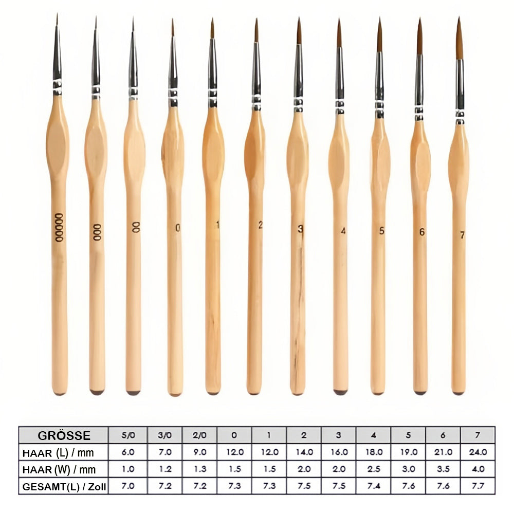 11 PRÄZISIONSPUNKTE -- 11 verschiedene Größen (5/0, 3/0, 2/0, 0,1, 2, 3, 4, 5, 6, 7) von Miniaturpinseln, um sicherzustellen, dass Sie immer den richtigen Pinsel haben.