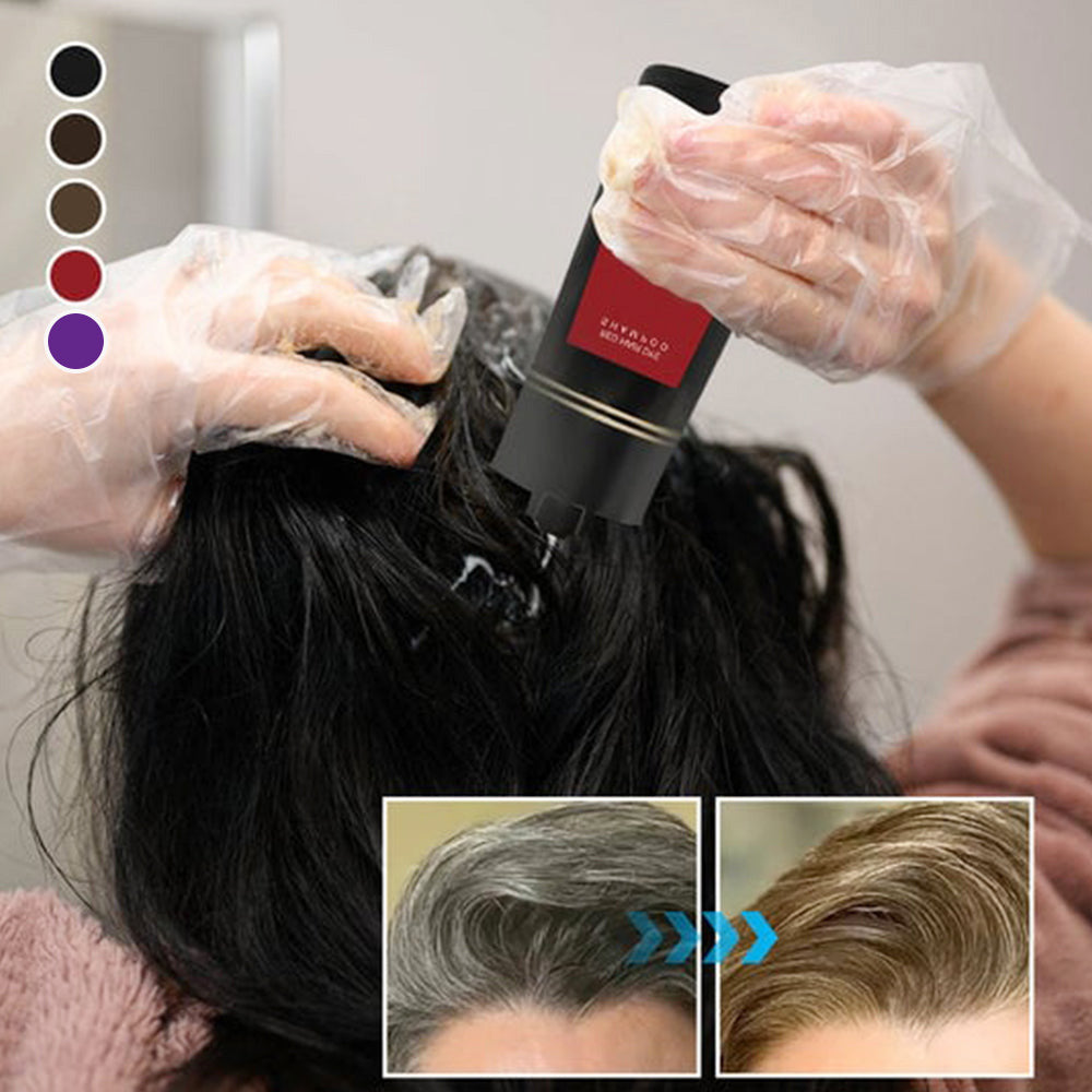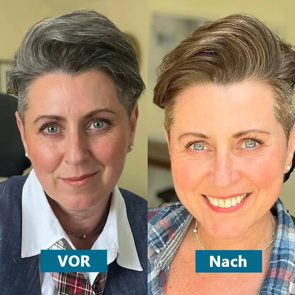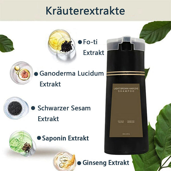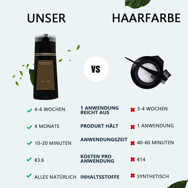 Wir bieten fünf verschiedene Farben an: Schwarz, Dunkelbraun, Hellbraun, Rot und Lila. Sie bieten eine perfekte Abdeckung, selbst bei den stärksten grauen Haaren. Die Deckkraft hält bis zu 4-6 Wochen an, je nachdem, wie oft Sie Ihr Haar waschen.