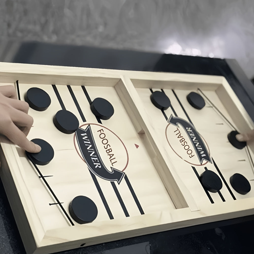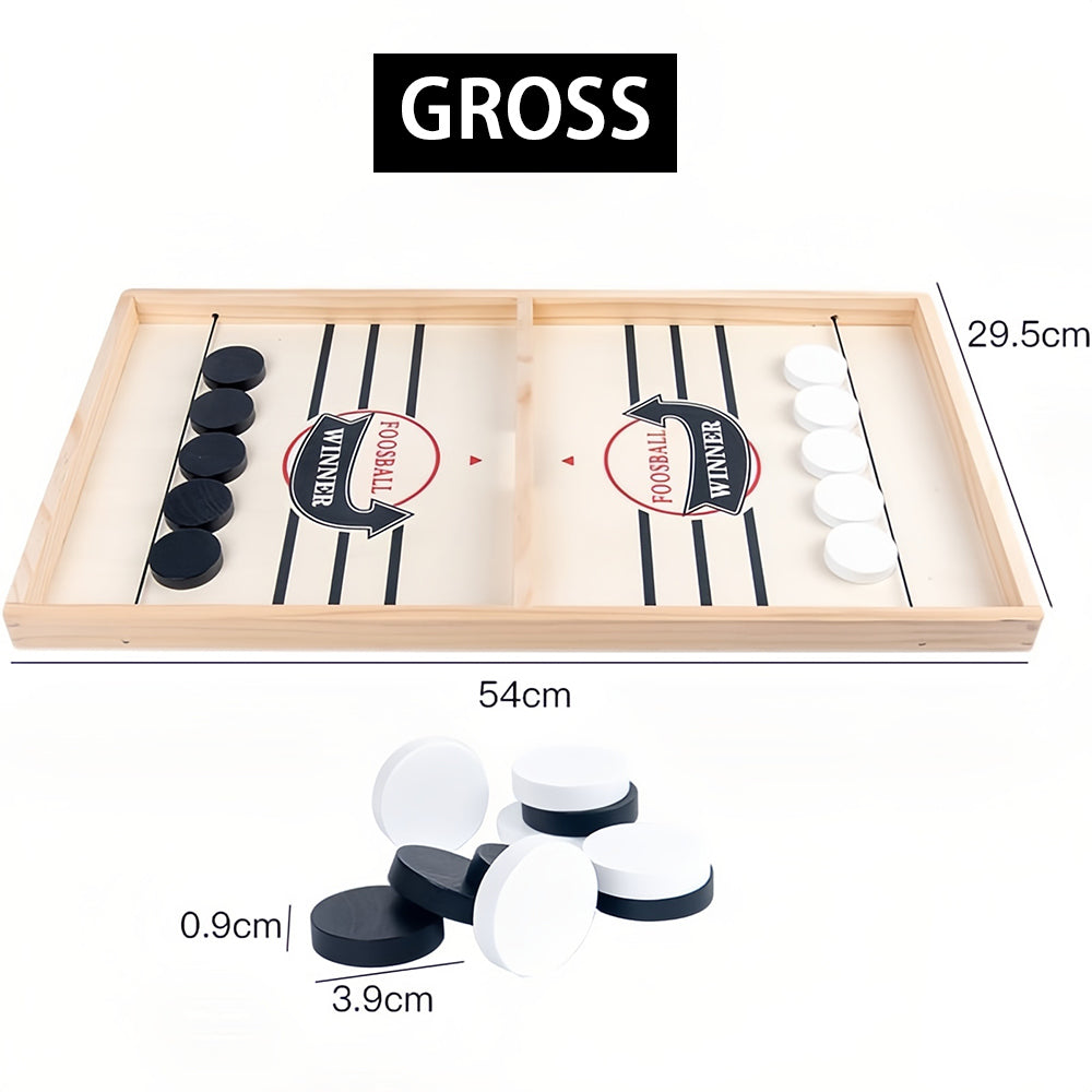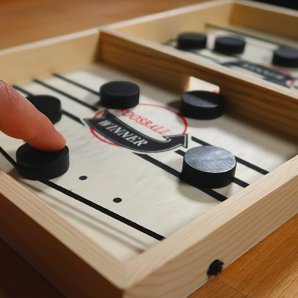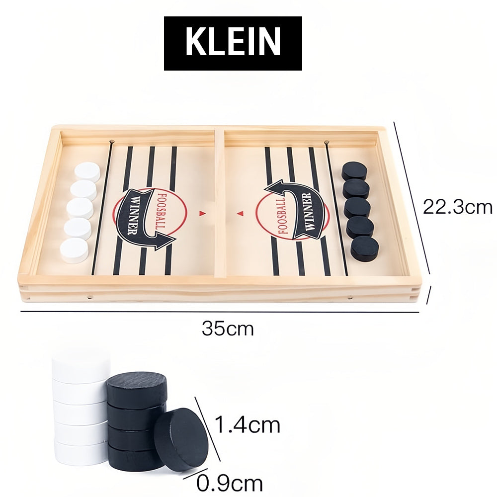 Ein Spiel voller Geschwindigkeit und Action, bei dem das Ziel darin besteht, alle Pucks auf die Seite des gegnerischen Spielers auf dem geteilten Spielbrett zu spielen. Der Vorgang muss jedoch nur mit einer Hand erfolgen und die Scheiben mithilfe des Gummibands durch die Öffnung auf die andere Seite geschoben werden! IN KLEIN ODER GROß ERHÄLTLICH!