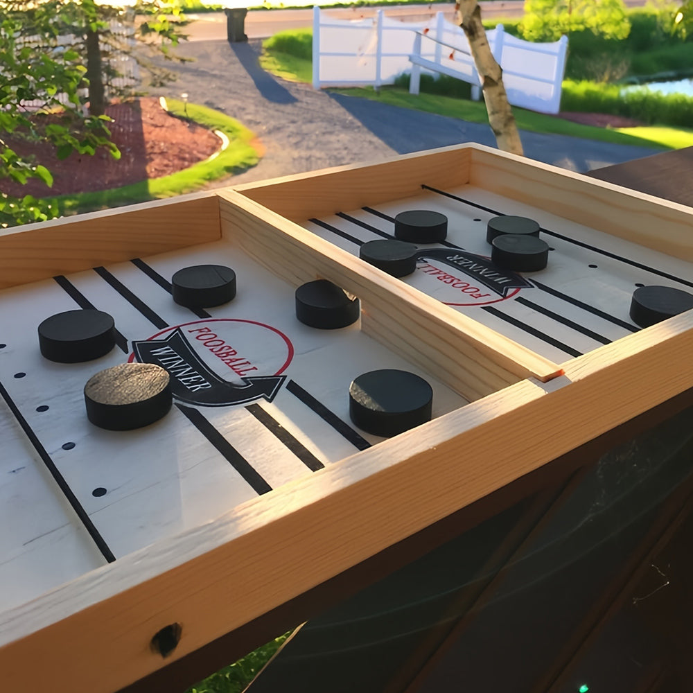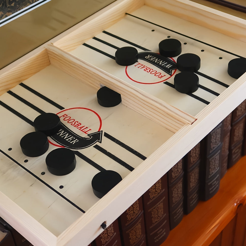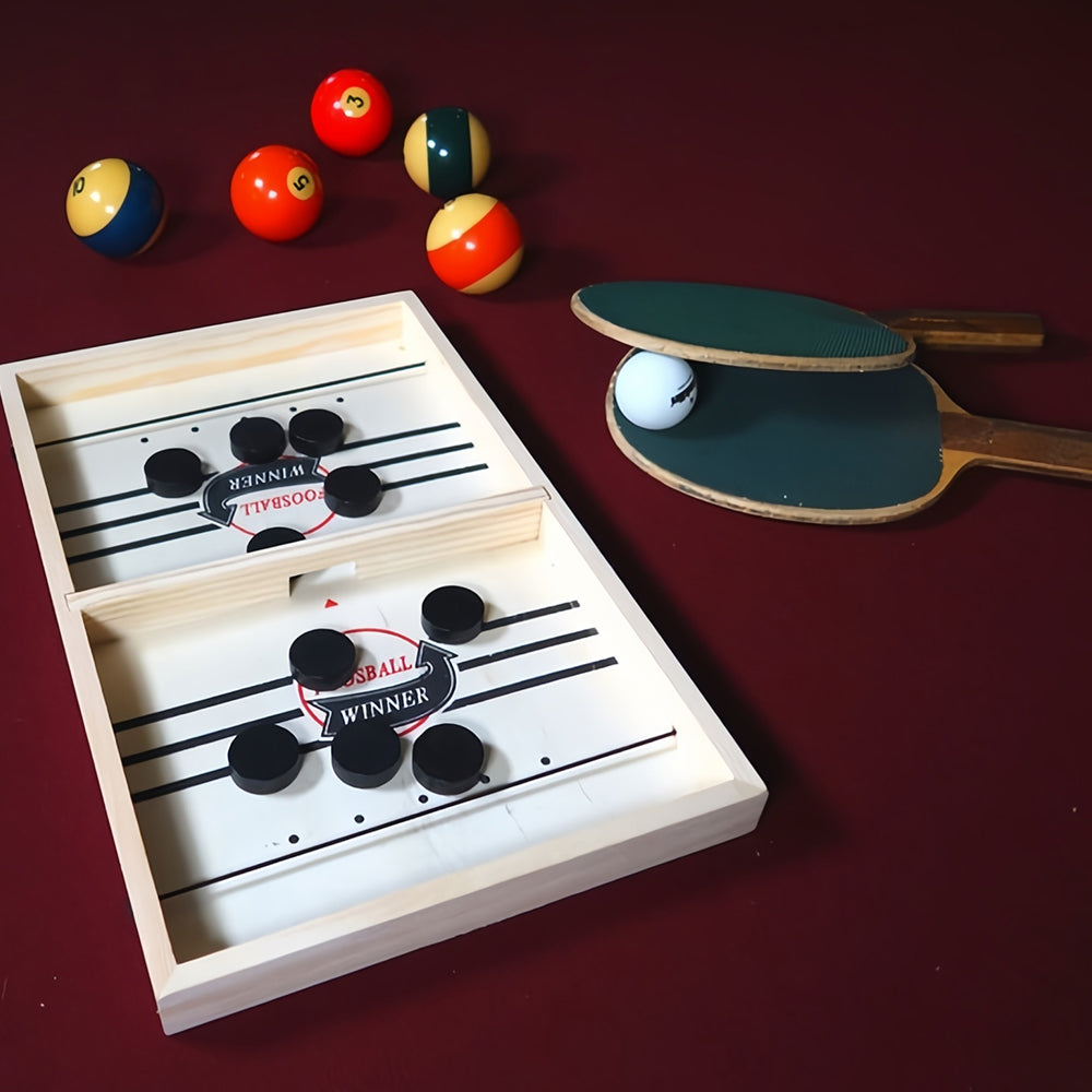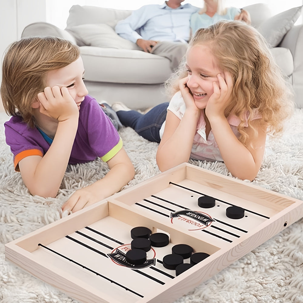 Ein Spiel voller Geschwindigkeit und Action, bei dem das Ziel darin besteht, alle Pucks auf die Seite des gegnerischen Spielers auf dem geteilten Spielbrett zu spielen. Der Vorgang muss jedoch nur mit einer Hand erfolgen und die Scheiben mithilfe des Gummibands durch die Öffnung auf die andere Seite geschoben werden! IN KLEIN ODER GROß ERHÄLTLICH!